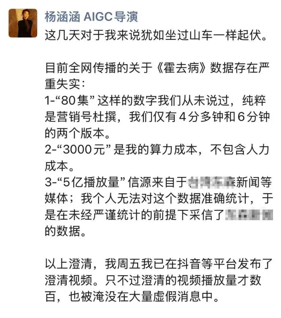 导演杨涵涵不得不亲自下场辟谣:3000元仅为算力成本,不包含人力;团队实际有近20人,并非网传的3人;“80集短剧”更是无稽之谈,目前仅完成了4分钟和6分钟的两条短片。至于5亿播放,来源于其他媒体报道,她本人并未进行严谨统计。