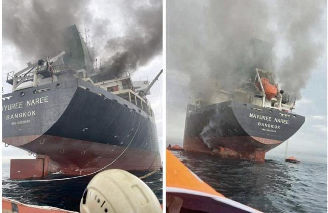 泰国散装货轮“Mayuree Naree号”11日在波斯湾荷莫兹海峡阿曼以北海域遭遇不明火力攻击。泰国海军发布照片显示,船身底部破了大洞,内有火光。(泰国皇家海军提供/路透)