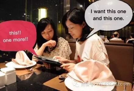 独白:至今只吃一道菜:this one。我朋友有次想要个叉子,不知道怎么说,于是举起了我的叉子对服务生说:this,one more!!