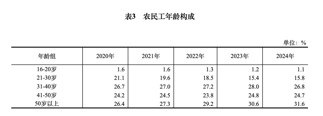 国家统计局发布的《2024年农民工监测调查报告》也能透视其中的一角,报告显示,全国农民工平均年龄43.2岁。其中,50岁以上的农民工占近三分之一,约31.6%。
