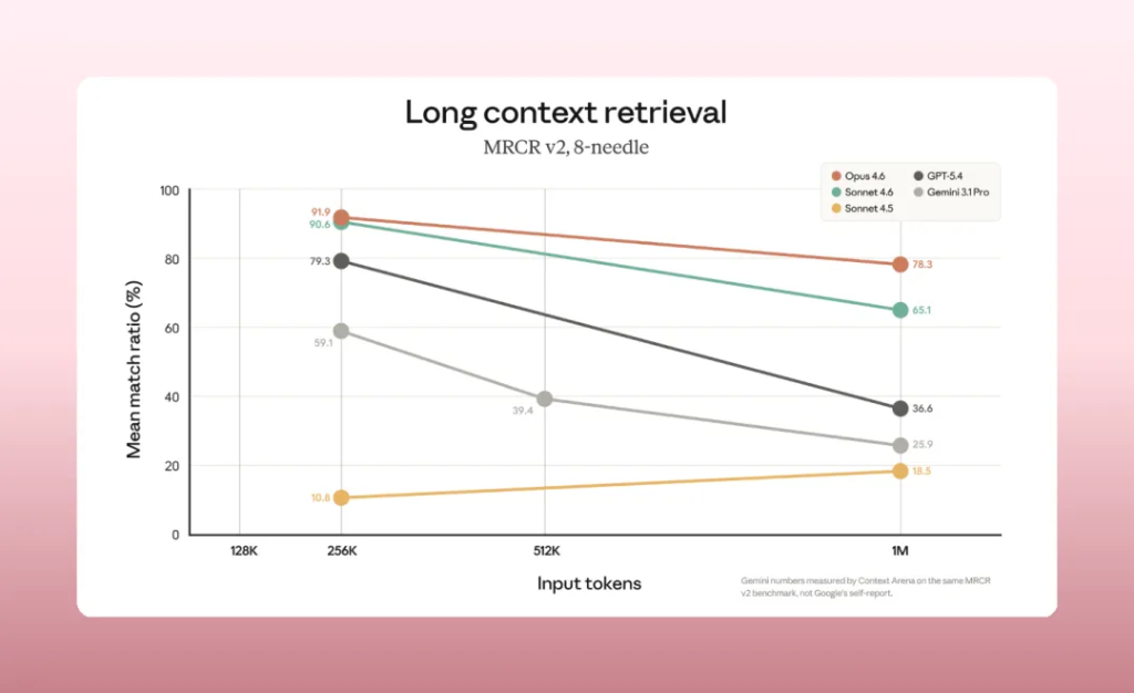 当然,百万级吞吐量的前提是模型能够准确召回细节并进行有效推理。在MRCR v2评测中,Opus 4.6拿下了78.3%的分数,在所有具备同等上下文长度的前沿大模型中位列第一。