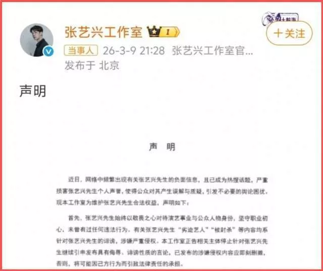 张艺兴工作室在3月9日的声明里,只否认了“劣迹艺人”和“封杀”的说法,说是诽谤,已经取证准备告了,然后强调艺兴刚做了手术,正在休养,四五月就会出来工作。