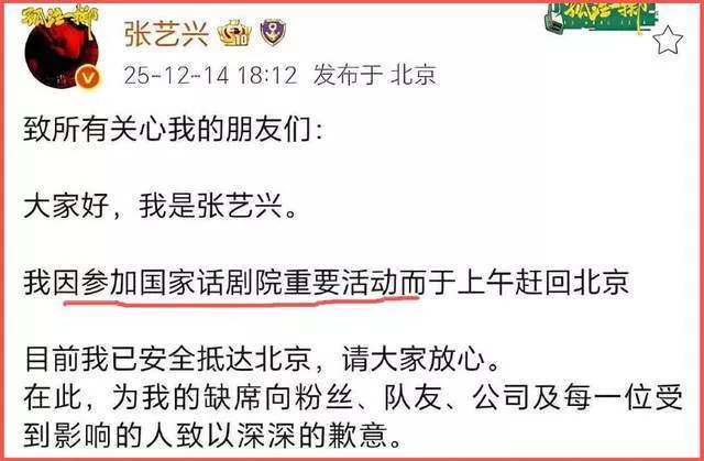当时张艺兴要去参加EXO合体活动,为了安抚粉丝,他把原因推给了国家话剧院,说是要参加国话的活动,才不得不赶回国内 。