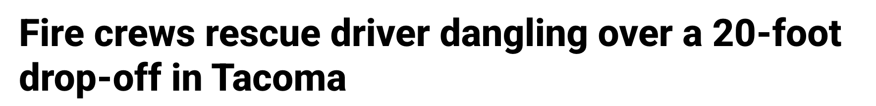 周六(3月14日)中午,华盛顿州塔科马(Tacoma)市中心上演了惊心动魄的一幕。一辆汽车冲破了铁丝网护栏,半个车身悬空挂在20英尺(约6米)高的混凝土堤坝边缘,摇摇欲坠。所幸救援人员及时赶到,将被困司机安全救出。