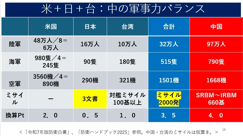 3月12日,小川清史演说时以此投影片解析美日台军事能力。(小川清史提供)