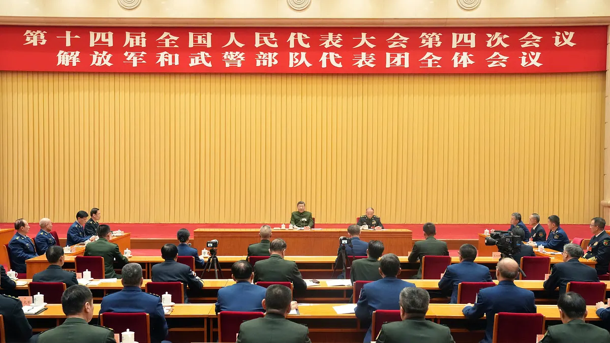3月7日,第十四届全国人民代表大会第四次会议期间中国人民解放军和武警部队代表团全体会议上,主席台仅剩中国国家主席习近平(左)、军委会副主席张升民。(美联社)