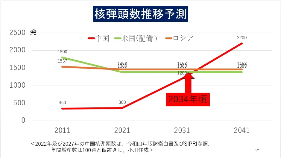 3月12日,小川清史演说时指出,美国目前拥有1500发以上核弹头,中国约600至700发。(小川清史提供)