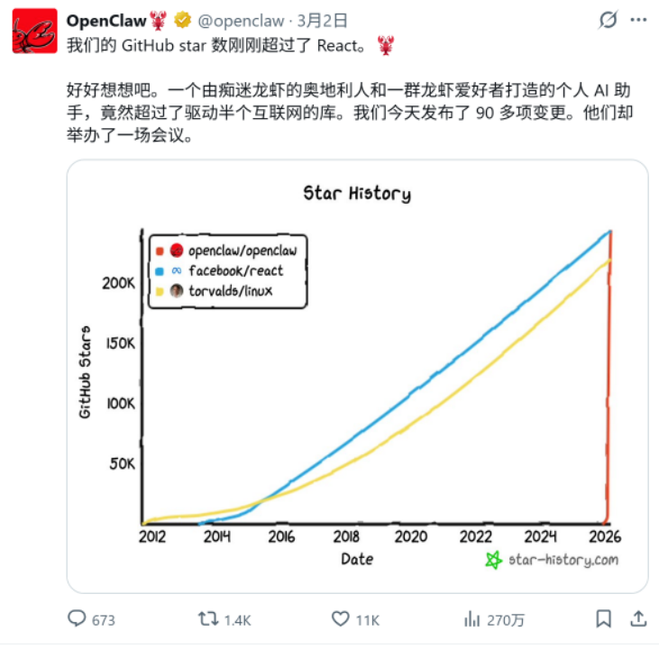 在 GitHub 这个全球程序员的 “开源圣地” 上,OpenClaw 在 3 月 2 日超越了所有开源软件的星标数(截至 3 月 9 日为 28.3 万个),短短几周就成为有史以来最受欢迎的开源项目,其增长速度之快,令坐拥数十年积累的操作系统先驱 Linux 也望尘莫及。