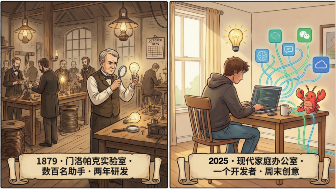 这只 “龙虾” 的诞生过程,像极了百年前爱迪生在门洛帕克实验室发明电灯的故事,但速度却快了整整 100 倍。它不需要庞大的研发团队,不需要数亿美元的预算,甚至不需要漫长的开发周期。一个 “退休” 程序员,利用现成的大模型能力,在一个周末就能构建出颠覆性的应用,改变了整个行业的面貌。