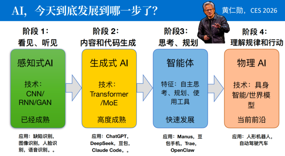 按照黄仁勋在今年 1 月举行的 CES 2026 大会上提出的观点,AI 产业的发展,可以分为感知式 AI、生成式 AI、智能体到物理 AI 这四个阶段。