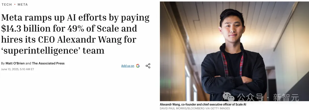 2025年6月,扎克伯格宣布以143亿美元收购Scale AI约49%的股权,拿真金白银换来一个人——Scale AI创始人、28岁的Alexandr Wang(汪滔)。