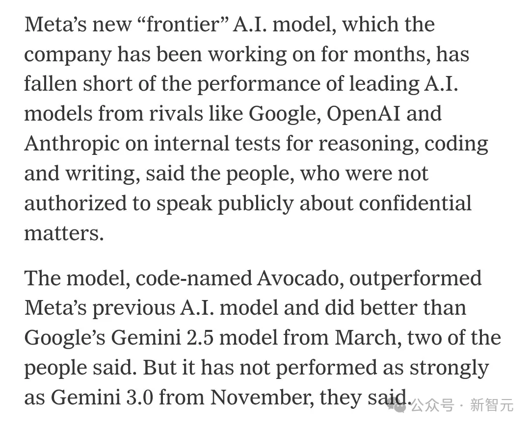 尽管如此,Meta倾尽心血打造的「牛油果」,在推理、编码和写作能力的内部测试中,竟然不如去年11月发布的谷歌Gemini 3.0。