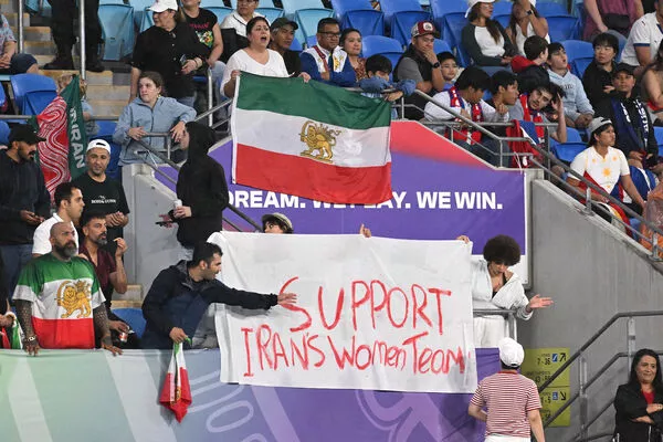 ▲伊朗女足在澳洲参加亚洲杯,场边有球迷高举标语。(图/达志影像/美联社)