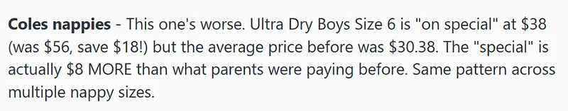 第三个例子更让人上火。他提到Coles的纸尿裤,比如Ultra Dry Boys Size 6,页面上写着:“现价38澳元,原价56澳元,立省18澳元!”