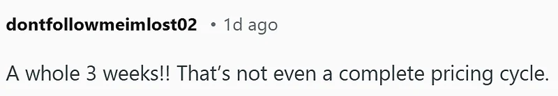 这个回答一出,评论区立刻有人泼冷水。“才3周??这甚至都不够完整跑完一个价格周期。”