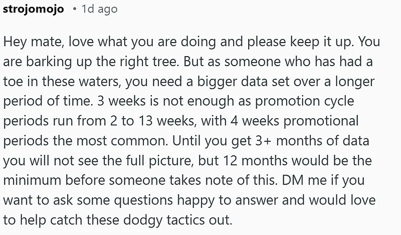 有比较专业的网友出来解释,说大超市的促销周期一般不是几天,而可能是2周到13周不等,其中4周促销周期最常见。他提醒说,至少要持续抓3个月以上,最好能做到12个月,这样别人看了才会真正重视。