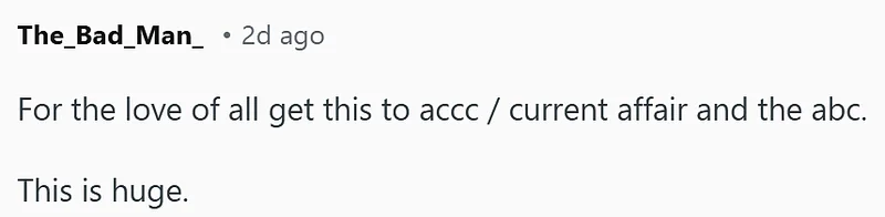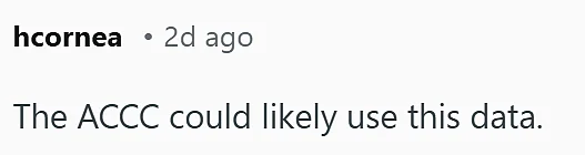 这篇帖子发出后,迅速引发大量网友讨论。不少人第一反应就是:赶紧把这些数据交给监管机构。“ACCC很可能用得上这些数据。”