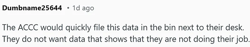 当然,也有不少网友对ACCC并不抱太大希望。“ACCC会很快把这些数据扔进桌边的垃圾桶里。他们根本不想看到能证明自己没在认真干活的数据。”