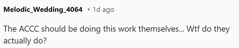 还有网友吐槽,像这种事情,其实根本不应该靠普通人自己去做。“这些工作本来就该ACCC自己做……他们到底平时都在干嘛?”