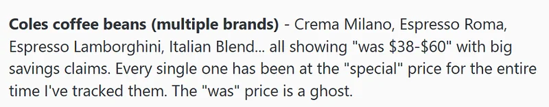 第二个让他震惊的是Coles的咖啡豆。他说,像Crema Milano、Espresso Roma等不同品牌或口味的咖啡豆,经常都会显示“原价38到60澳元,现在大减价”。