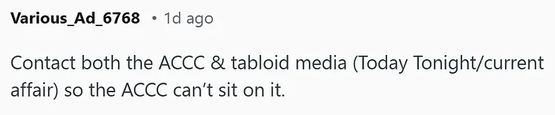 “去联系ACCC和媒体(比如A Current Affair),这样ACCC就没法把这事压着不处理了。”