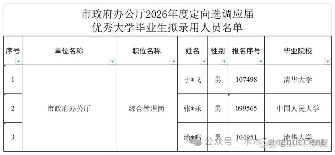 北京市政府办公厅2026年定向选调共录用3位毕业生,其中2人是清华大学,另外1人是中国人民大学,全部都是男性。