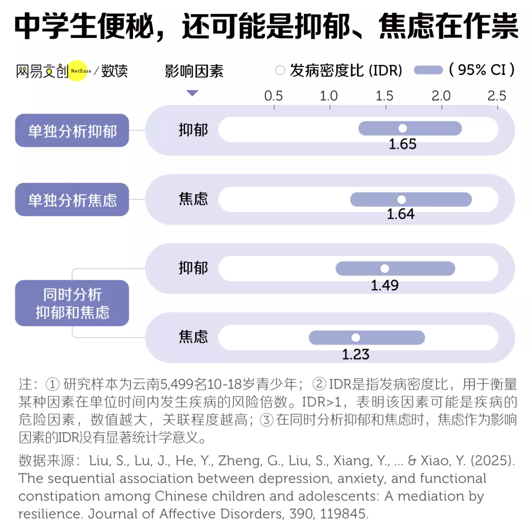 发表在《情感障碍杂志》的一项研究指出,存在抑郁症和焦虑症的学生,患上便秘的风险分别是普通学生的 1.65 倍和 1.64 倍 [8]。