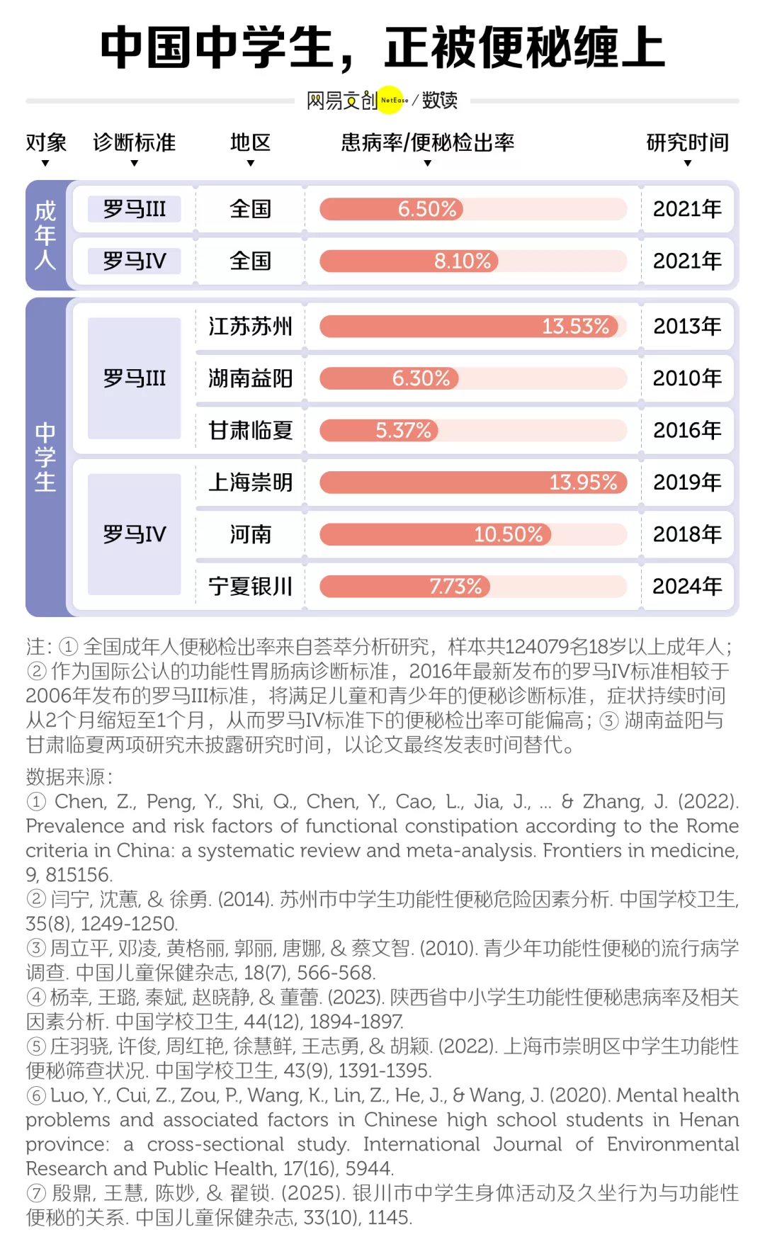 由于缺乏针对全国中学生的大型调查,我们整理了不同地区的中学生便秘研究,发现按罗马 IV 标准,上海崇明中学生便秘检出率在 13.95%,河南高中生为 10.5% [2][3]。换算成 40 人的班级,大约有 4-6 名“拉屎困难户”。
