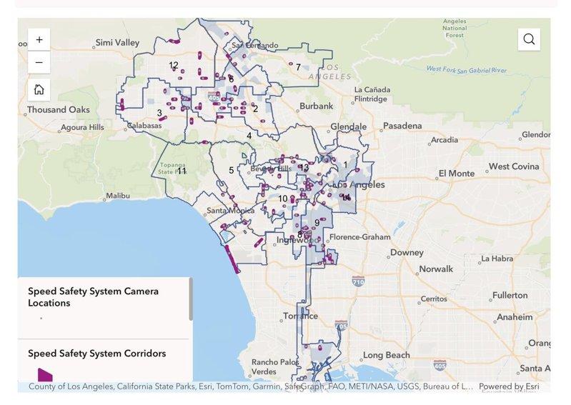 洛杉矶市交通局(LADOT)公布的Speed Safety System测速相机拟设位置地图。(取自LADOT)