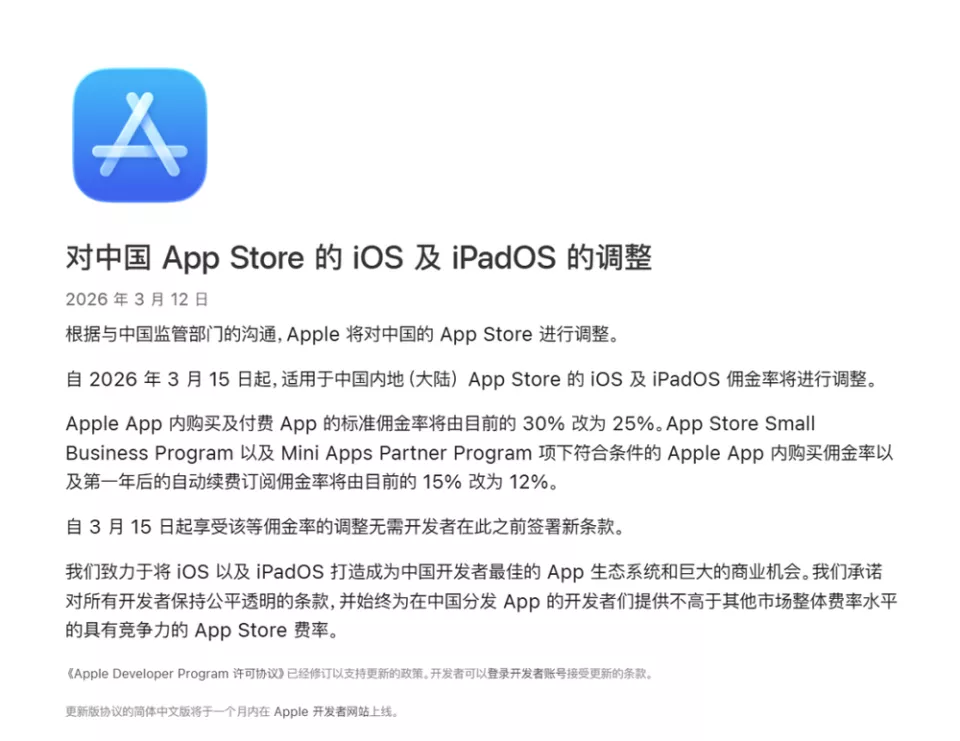 3 月 13 日,苹果发布官方公告称,经与中国监管部门沟通,自 2026 年 3 月 15 日起,针对中国内地 App Store 的佣金费率做出历史性下调: