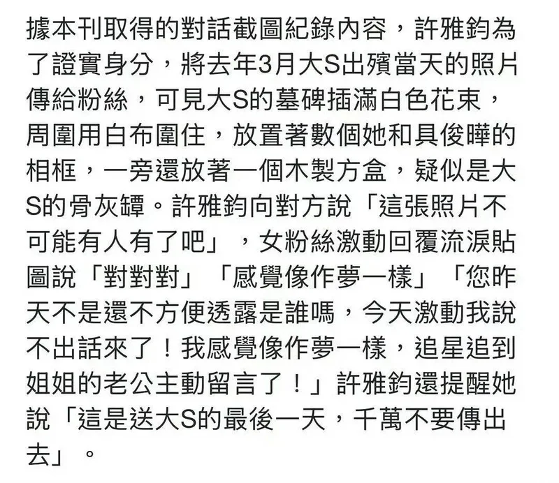 对方是个20多岁的台北女孩,在北京读书,平时爱发思念大S的动态。许雅钧主动加她好友,为了证明“我是真的许雅钧,不是水军”,直接甩出一张出殡当天的现场照片——插满白花的墓碑、大S和具俊晔的遗照相框、白色围挡……全是从未对外公开的独家画面。