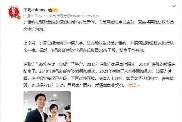 姜姓女子,浙江人,和许雅钧的儿子目前在美国。为什么送美国?因为许家喜欢美籍,三个女儿都在台湾出生,儿子一定要去美国拿身份。