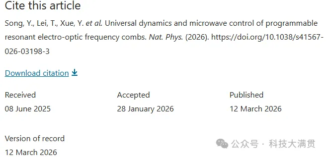 总之,该研究结果为广义上同步驱动的腔基电光系统提供了物理洞见,并将为下一代光子应用实现电控及电增强的梳齿发生器。据了解,该研究于2025年6月投稿,2026年1月文章被正式接受,如今正式发表。