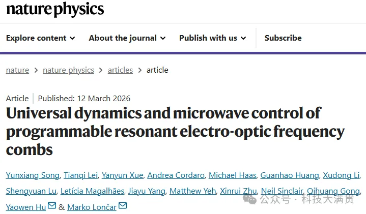 3月12日,北京大学胡耀文与哈佛大学的Marko Lončar合作,作为共同通讯作者在物理学顶级期刊《Nature Physics》上发表最新成果。该研究报道了可编程谐振电光频率梳的普适动力学与微波调控。
