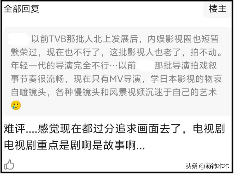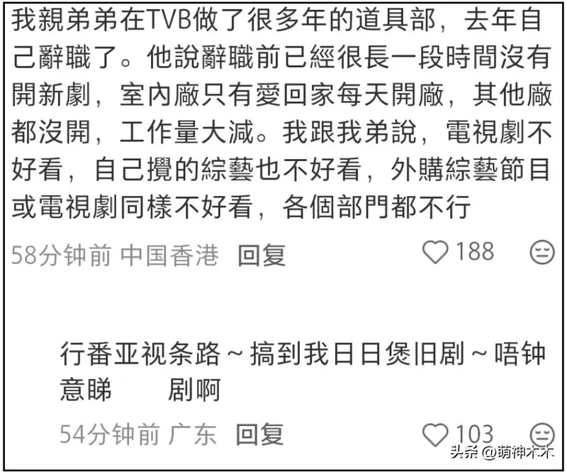 正如网友所说,优秀幕后人才流失是影视行业真正的痛点,不仅仅发生在TVB,整个内娱都是一样的,提起来就是没有好故事、没有好编剧,人人都明白,人人都不知道如何解决,或者说无法解决。