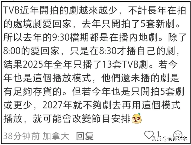网友掐指一算,TVB自制剧现有存货只够播放到2027年,还是同时播出其他平台剧集和老剧的前提下,和亚视倒闭之前的情况几乎一模一样。