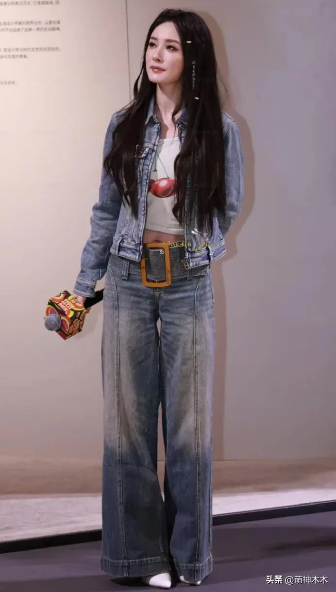 而全身造型,杨幂的搭配也有些过时,上装是牛仔外套搭露脐白T,下装是高腰阔腿裤搭尖头高跟鞋,按道理来说这一套不会出大错。但或许可能真的是造型与年龄不适配,从头到脚都很奇怪,头发搭在肩上显得很厚重累赘,阔腿裤的宽腰带特别浮夸,没有显出复古的气质,就是很土,还有一种硬凑的违和感。