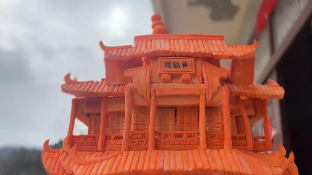 湖北恩施25岁女孩用牙齿啃胡萝卜,啃出70cm高的黄鹤楼。(抖音@优点点)