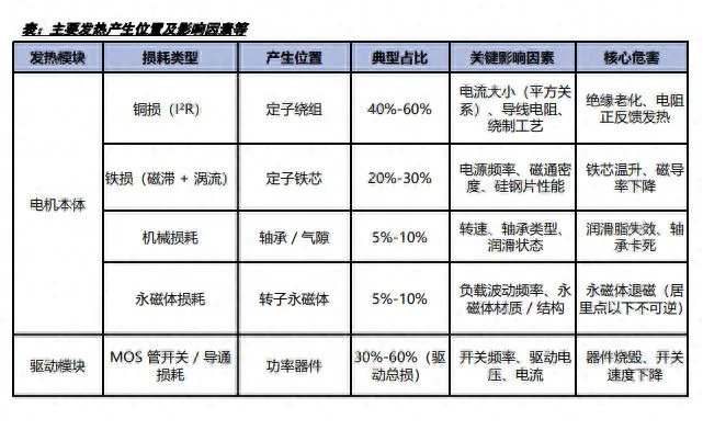 报告把关节电机损耗拆得很细。典型占比里,铜损(定子绕组)40%-60%,铁损(定子铁芯,磁滞+涡流)20%-30%,机械损耗(轴承/气隙)5%-10%,永磁体损耗(转子永磁体)5%-10%。驱动模块里功率器件(MOS等)的开关/导通损耗可占“驱动总损”的30%-60%。