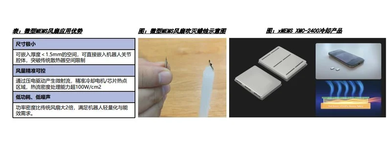 优必选的关节结构专利:通过关节模组结构简化、设置中空结构、在壳体外壁安装散热装置(如散热风扇)进行风冷。MEMS微型风扇:厚度可嵌入