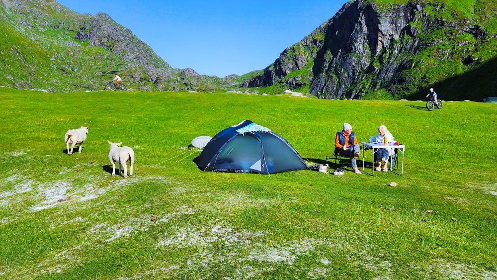 露营点依山傍水, GPS: 68.187902, 14.224485。露营点的对面有一个停车场。