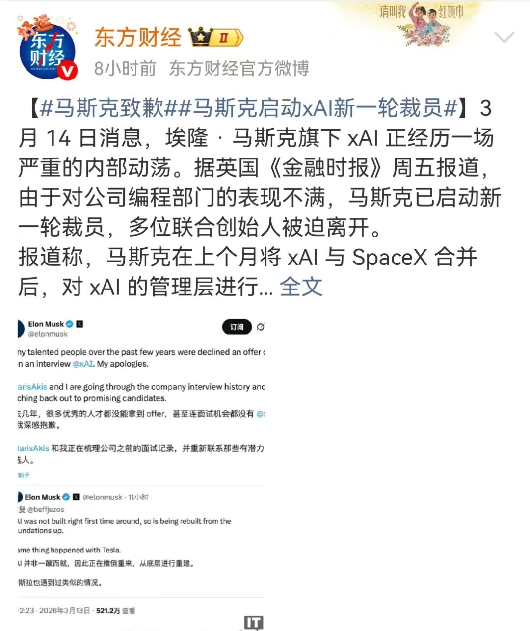 3月14日,据相关媒体消息,马斯克旗下的人工智能公司xAI正经历一场剧烈的内部动荡。由于对公司编程部门的表现深感不满,马斯克直接启动了新一轮裁员。