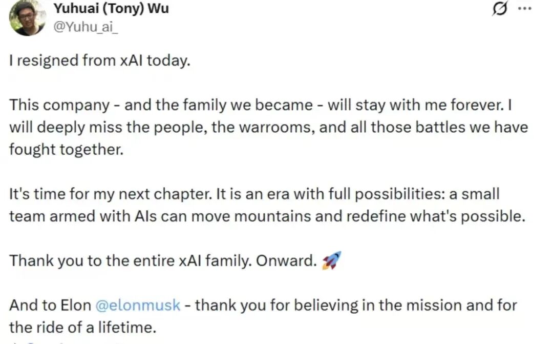 而更早之前的2月,联合创始人、被认为是Grok-3模型重要技术贡献者的数学推理核心专家吴宇怀也宣布离职。