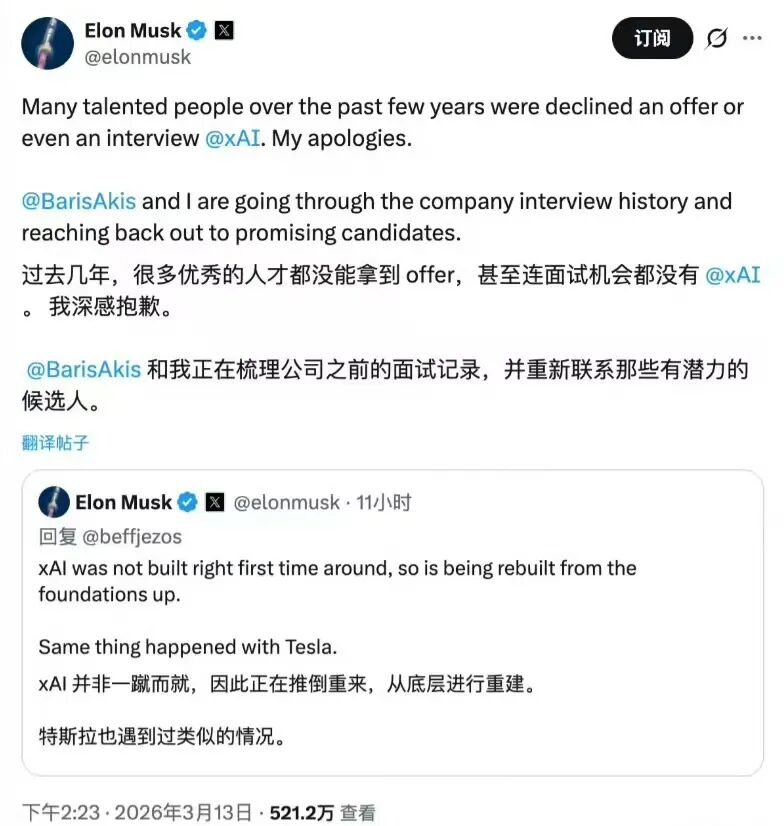 3月13日,马斯克在 X 上发文称:“过去几年里,许多才华横溢的人被 xAI 拒绝了工作机会甚至面试机会。我对此表示歉意。”他表示将重新联系那些有潜力的候选人。