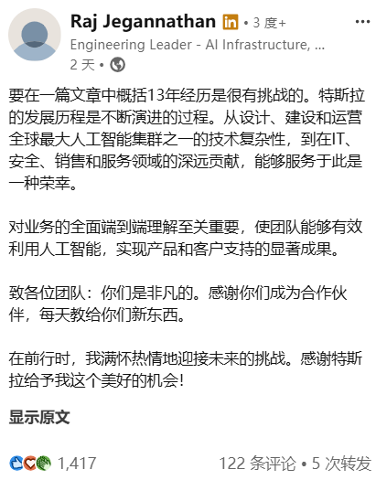 前不久,特斯拉副总裁拉吉·杰加纳坦在LinkedIn上宣布离职,结束了长达13年的特斯拉生涯。