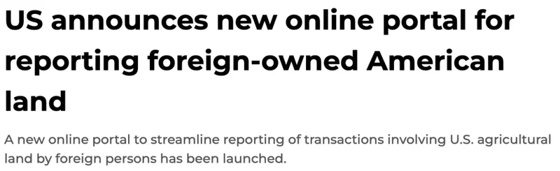 在宣布系统上线时,美国农业部长Brooke Rollins强调,美国政府正在加强对农业用地所有权的监管。“美国农地是重要的国家资源,我们必须确保信息透明,并了解外国资本在其中的参与情况。”