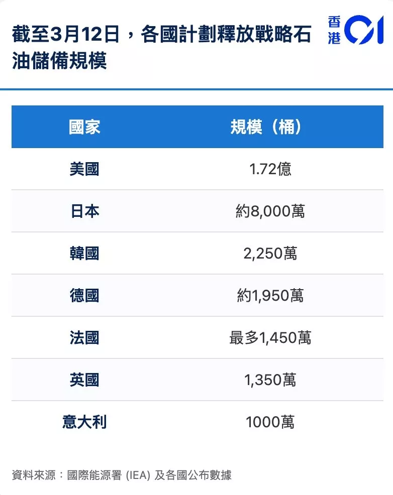 2026年3月11日,国际能源署(IEA)32个成员国将从紧急储备中释放共4亿桶石油。此数量是组织成立以来最大规模的储备释出行动。图为已知各国将释出的战略石油储备数量。(香港01)