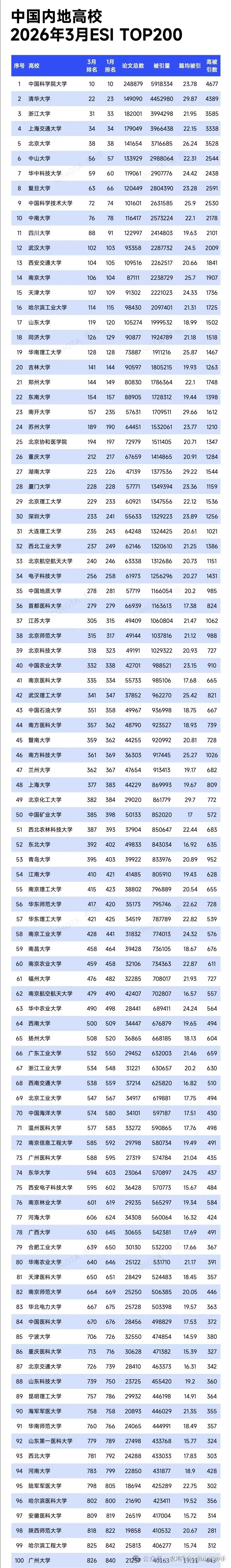 ESI排名:中国内地高校Top100名单水木TsinghuaCent
