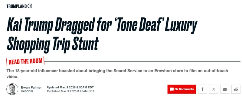 众多网友对她的购物行为发表看法,有人将其与玛丽·安托瓦内特(Marie Antoinette)相提并论,并指责该内容在全美食品与油价上涨、以及中东战争背景下显得“缺乏觉悟”。