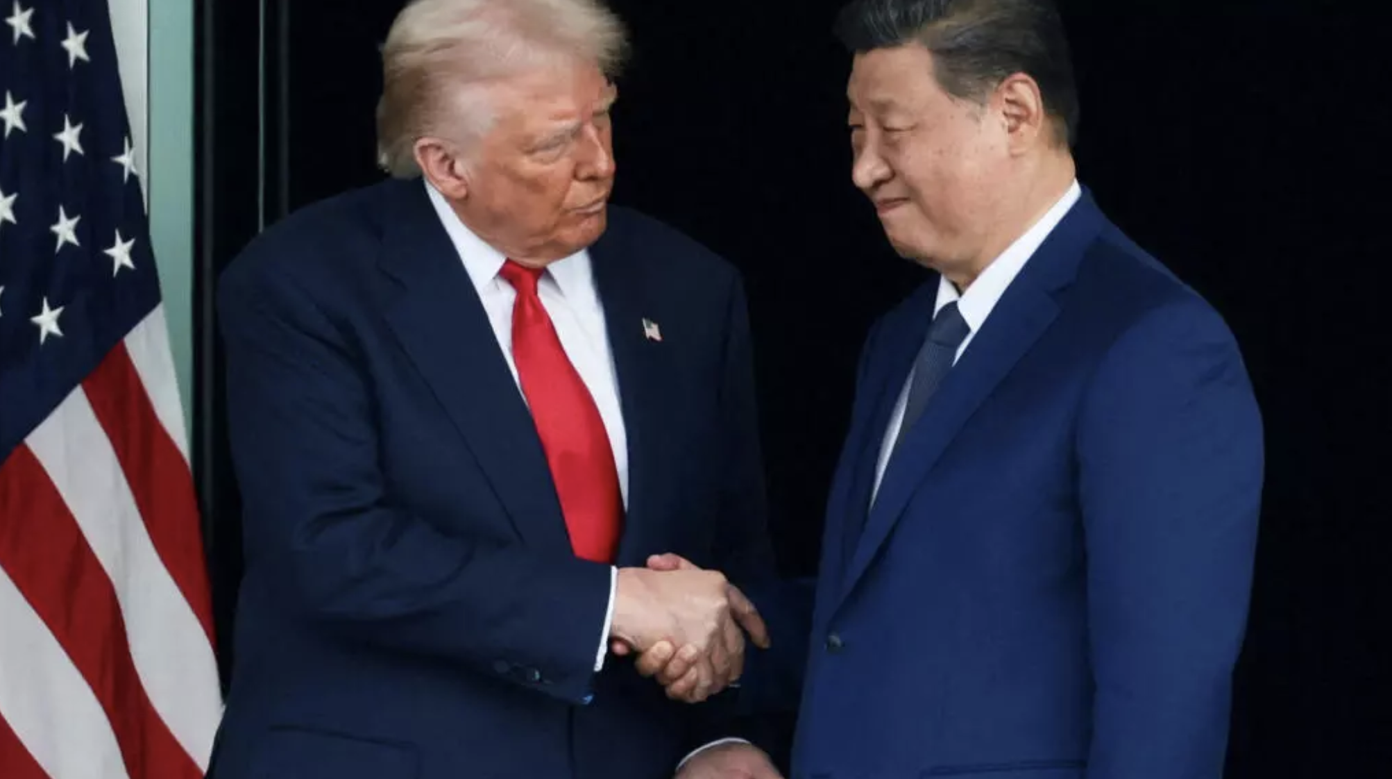 资料图片:2025年10月30日,在韩国釜山举行的亚太经合组织(APEC)峰会期间,美国总统特朗普与中国国家主席习近平在金海国际机场举行双边会晤时交谈。 REUTERS - Evelyn Hockstein